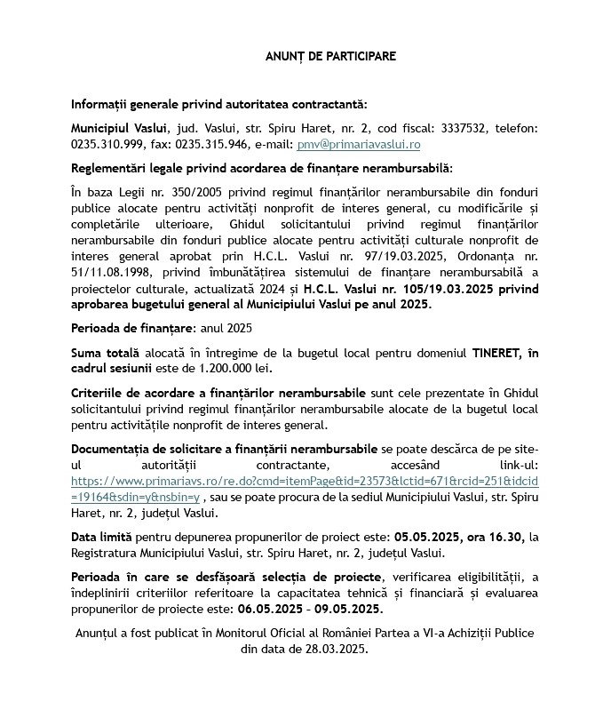 ANUNȚ Primăria municipiului Vaslui: Depunere proiecte cu finanțare nerambursabilă Domeniul Tineret, anul 2025