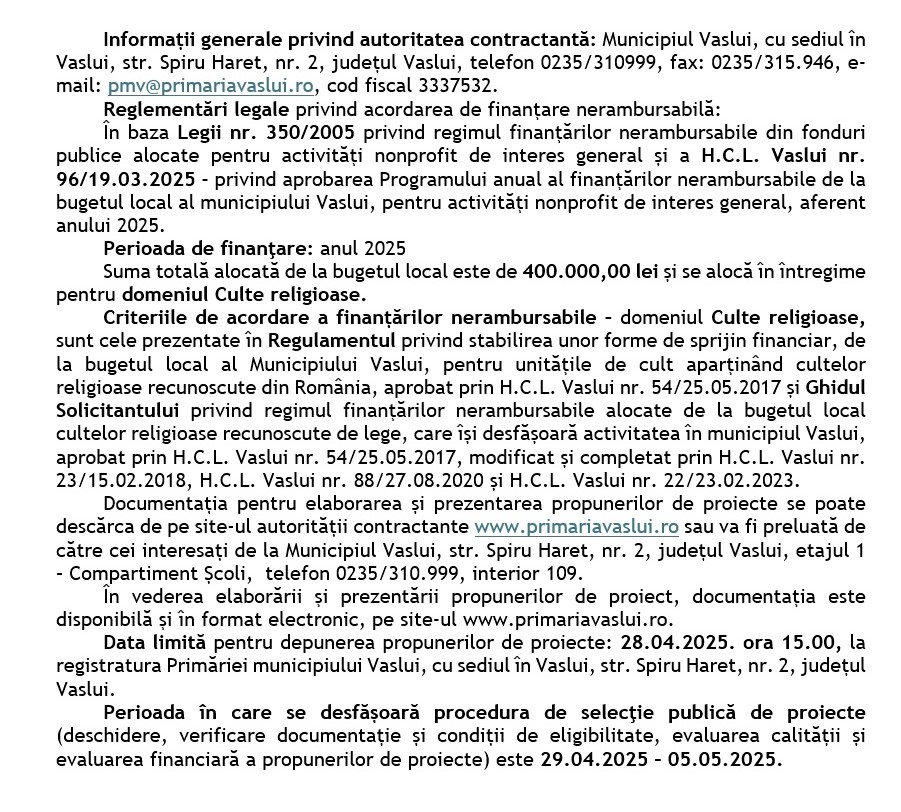Anunț Primăria Municipiului Vaslui: Finanțarea proiectelor cu finanțare nerambursabilă, Domeniul Culte Religioase, Anul 2025