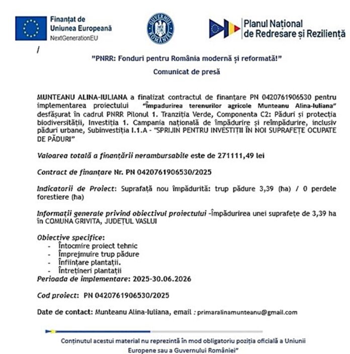 Comunicat de presă – Finalizare proiect “Ȋmpadurirea terenurilor agricole Munteanu Alina-Iuliana”
