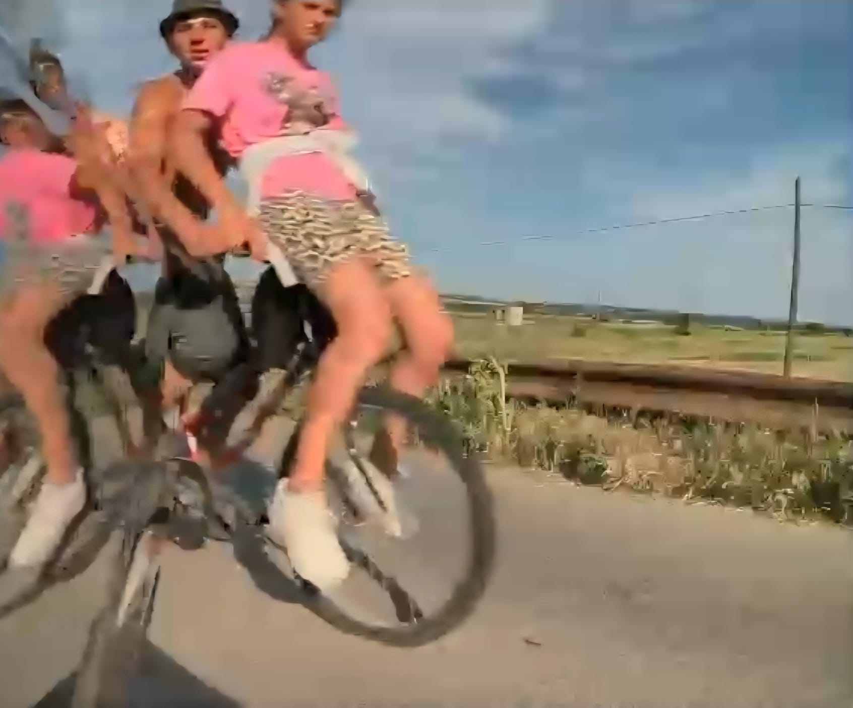 Doi adolescenți, dintr-o comună din jurul Vasluiului, au făcut spectacol, în această dimineață, pe drumul județean care leagă Muntenii de Jos de Lipovăț. Băiatul, cu pălărie pe cap și fără tricou, și-a invitat prietena la plimbare cu bicicleta. Timp de cinci kilometri, spun martorii oculari, fata a mers pe ghidonul bicicletei, voioasă foc, deși putea să se dezechilibreze și să cadă în fața unei mașini.