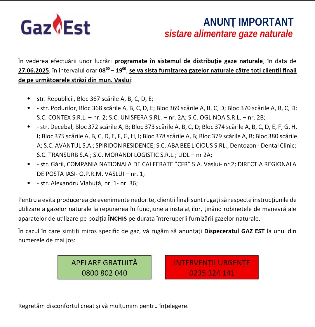 GAZ EST SA: Vineri, 27 iunie, se oprește furnizarea gazelor în câteva zone din Vaslui, între 8.00 și 19.00