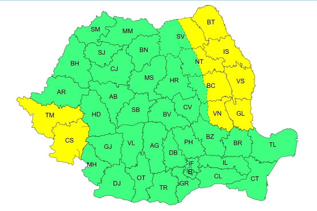 Meteorologii au emis, luni, o atenţionare cod galben de intensificări ale vântului, valabilă până miercuri dimineaţa în zone din zece judeţe din Banat și Moldova.