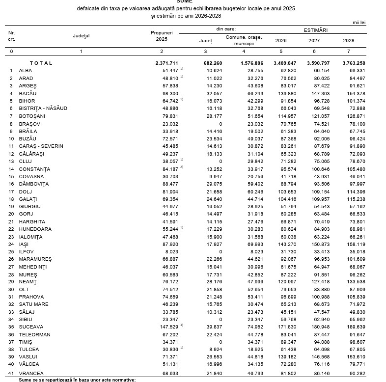Fiecare comună, oraș sau municipiu din județul Vaslui va primi, conform Legii Bugetului de Stat pe anul 2025, câte 900 de lei/locuitor, în baza datelor finale ale Recensământului General din 2022.