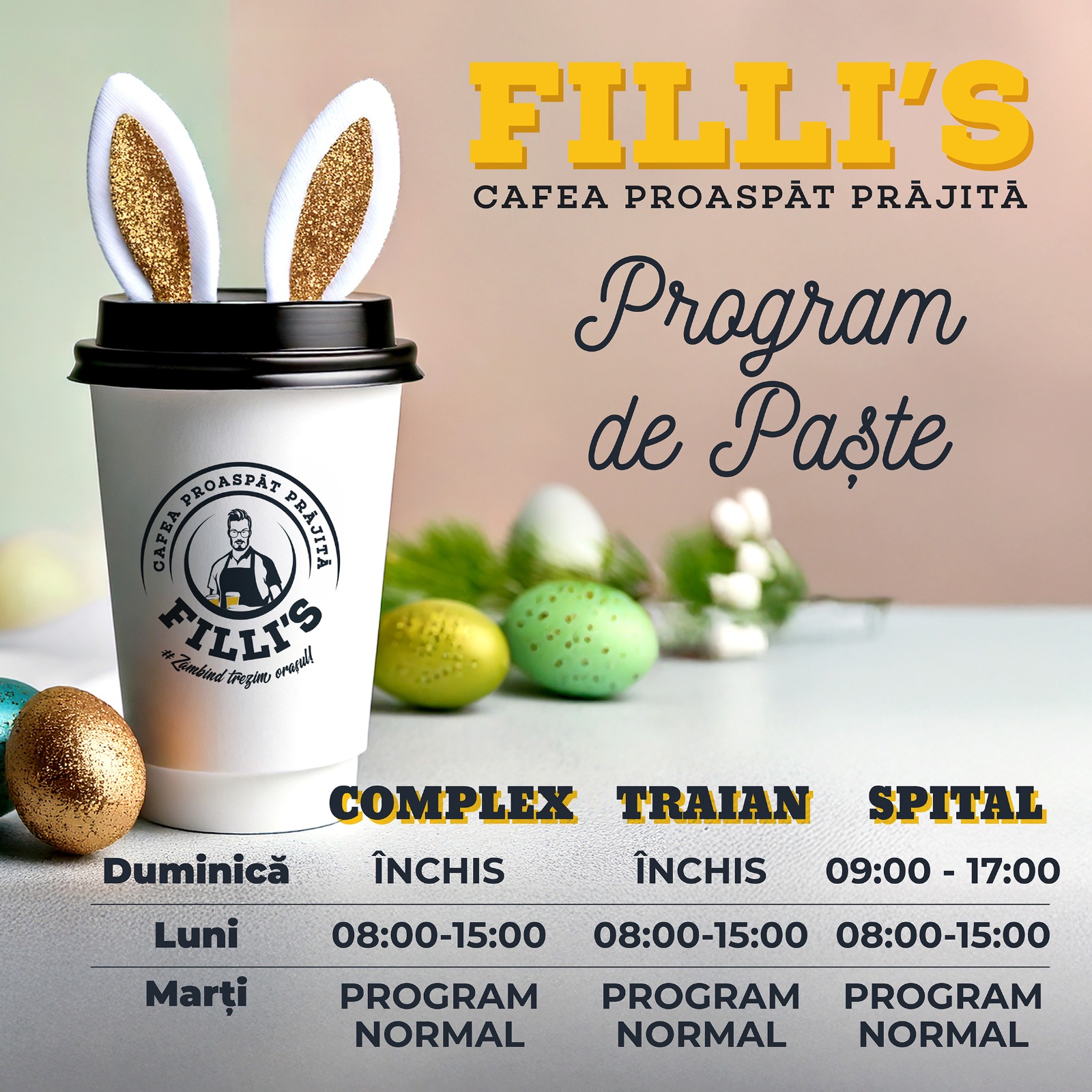 Lanțul de cafenele Filli’s, din Vaslui, a pregătit deja un program de funcționare pentru sărbătorile pascale, pentru ca toți clienții săi fideli să se bucure de cafeaua preferată, la prima oră a dimineții.
