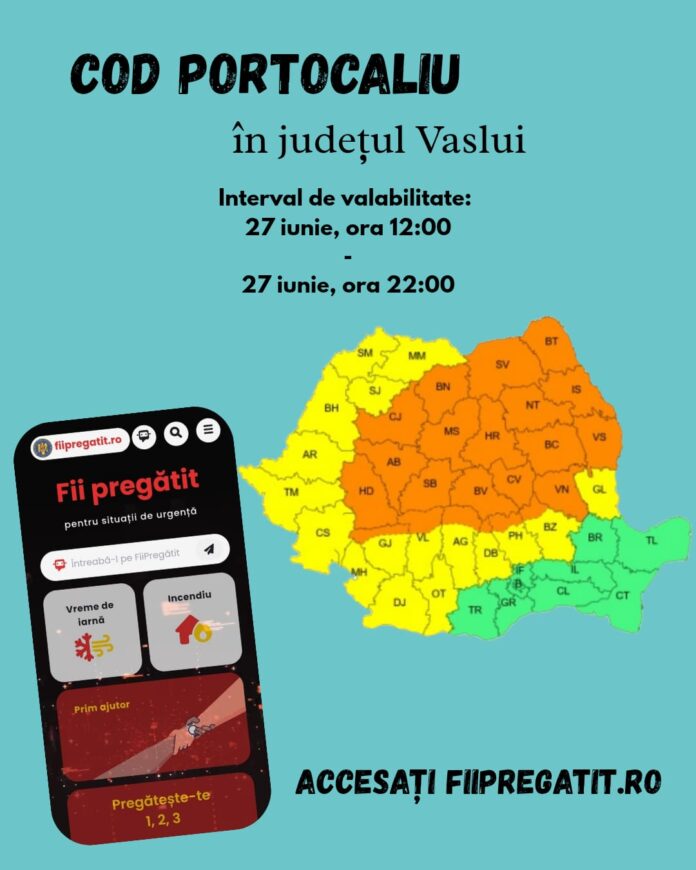 Vineri, 27 iunie, în intervalul orar 12:00 – 22:00 , județul Vaslui se află sub incidența unei avertizări meteorologice – *COD PORTOCALIU* .